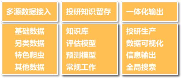 上游汇集多元数据到中游投研知识留存,再到下游成果一体化输出
